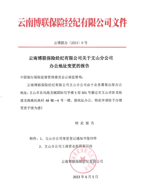 云南博聯(lián)保險經紀有限公司關于文山分公司辦公地址變更的報告