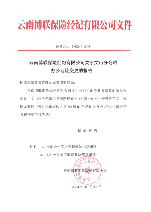 云南博聯(lián)保險經(jīng)紀有限公司關(guān)于文山分公司辦公地址變更的報告